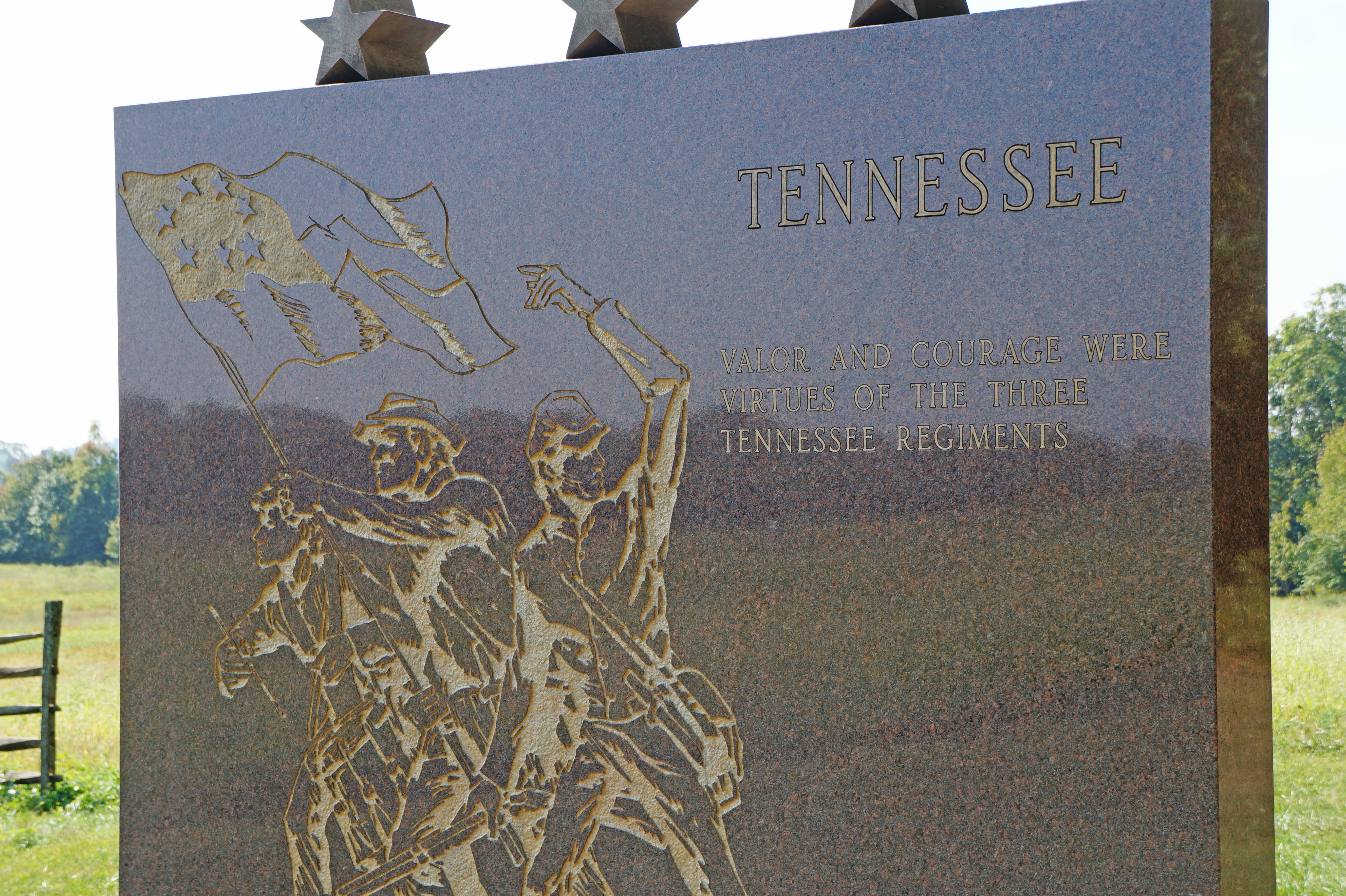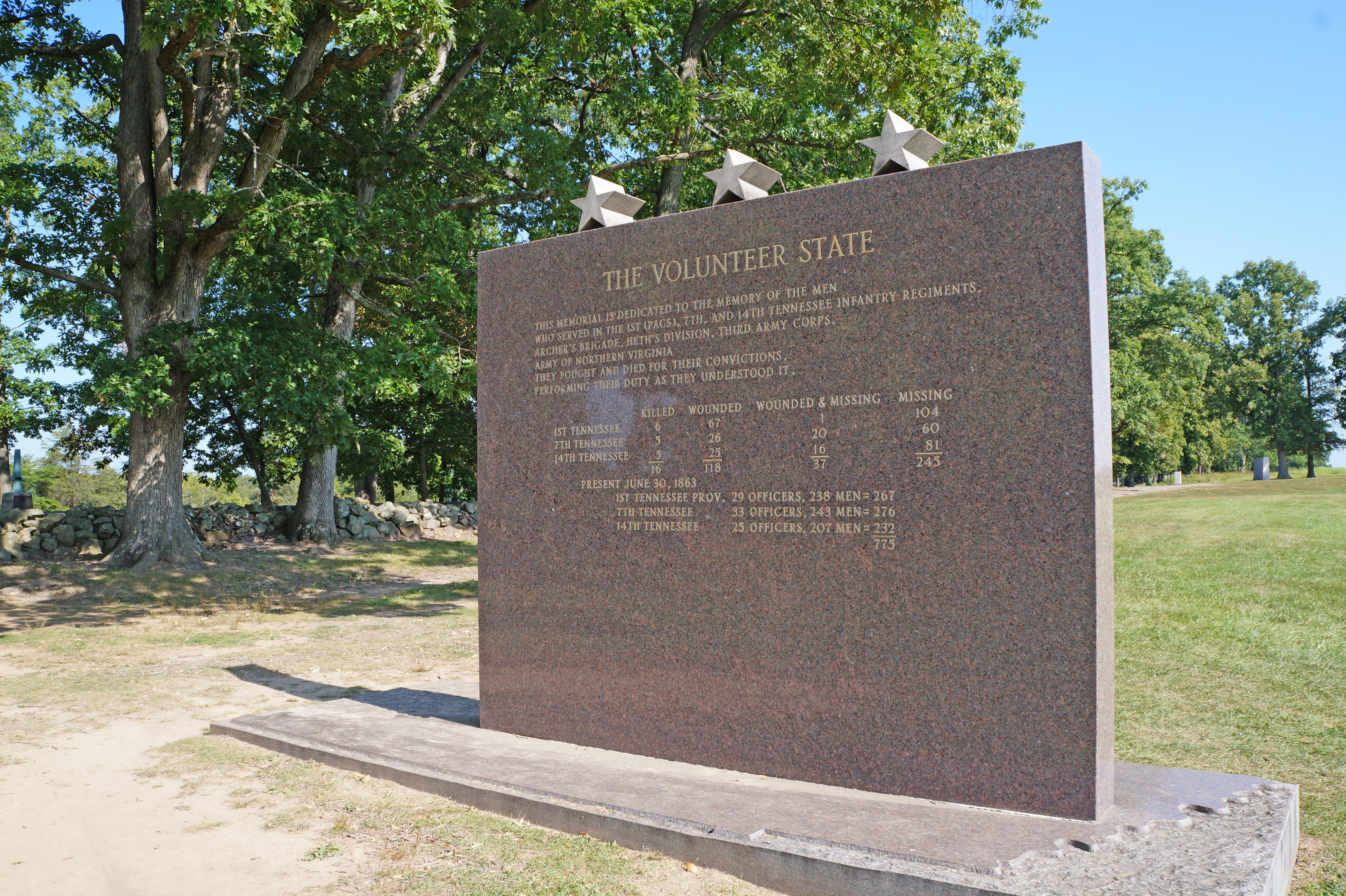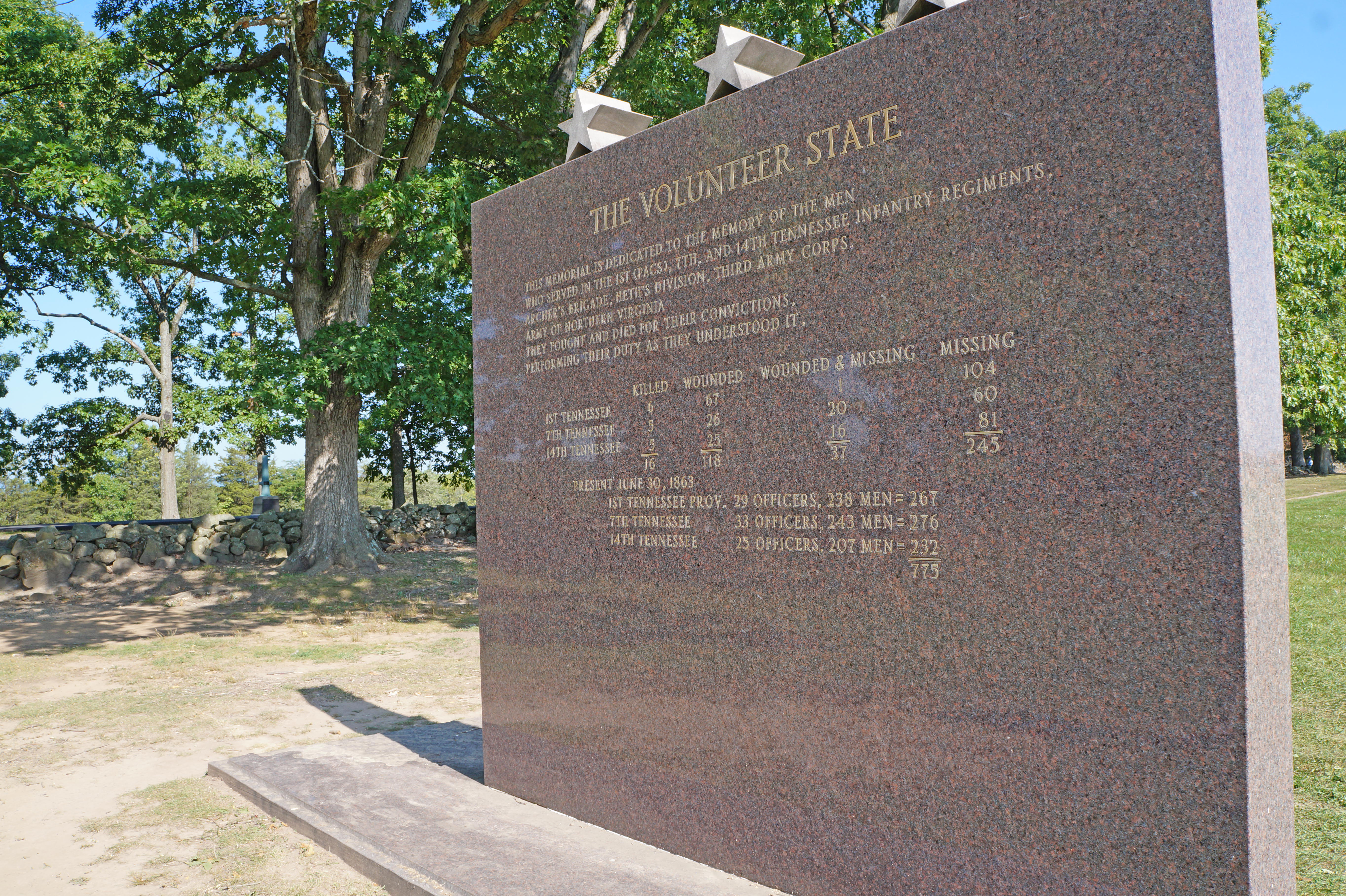 The Tennessee monument, dedicated on July 2, 1982, is the final Confederate state monument and uniquely funded entirely by private donations. It stands on a base shaped like Tennessee, with its 16-foot length symbolizing Tennessee as the 16th state of the Union. The monument features three soldiers and three stars, representing the three Tennessee regiments that fought at Gettysburg.