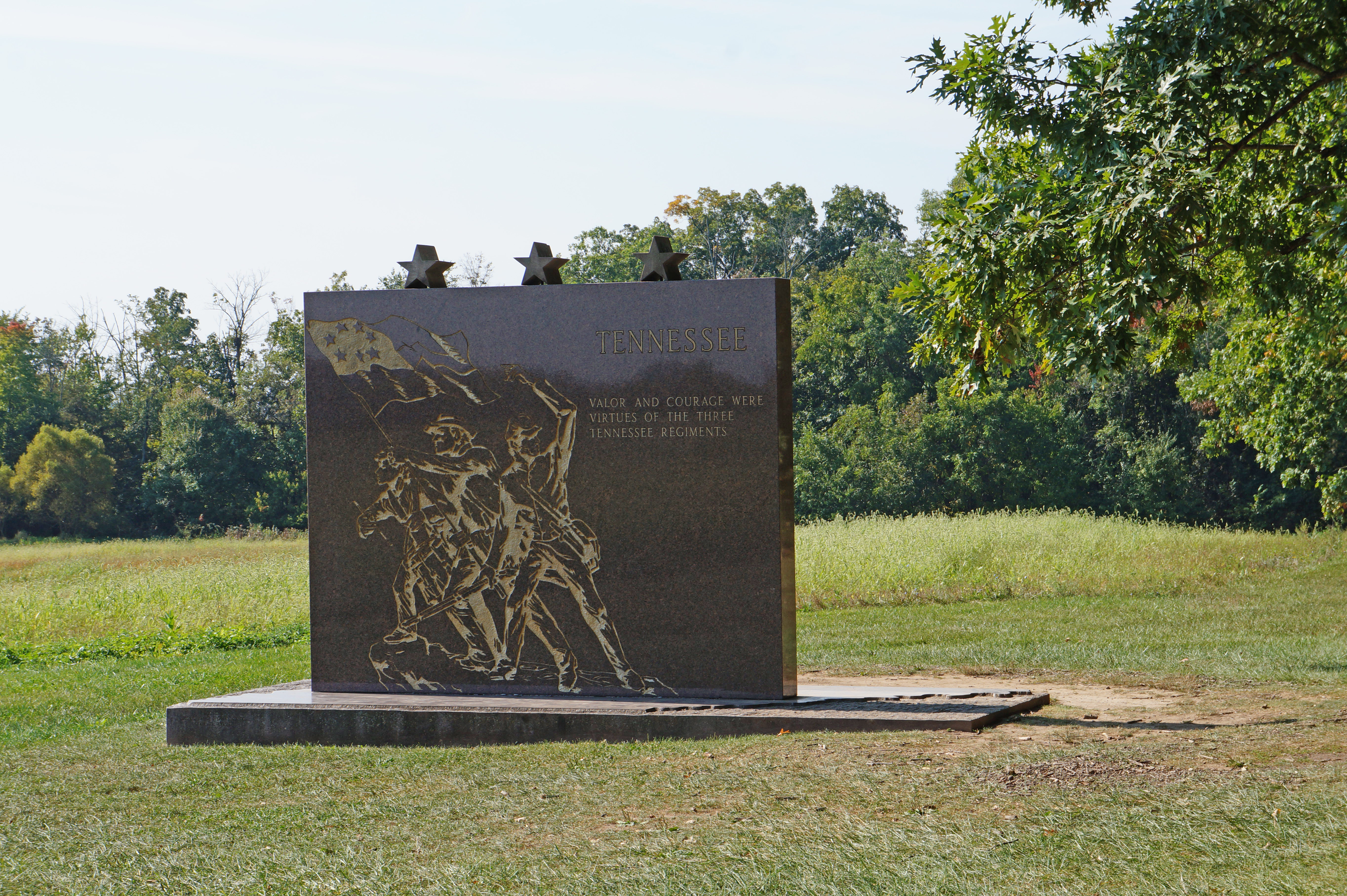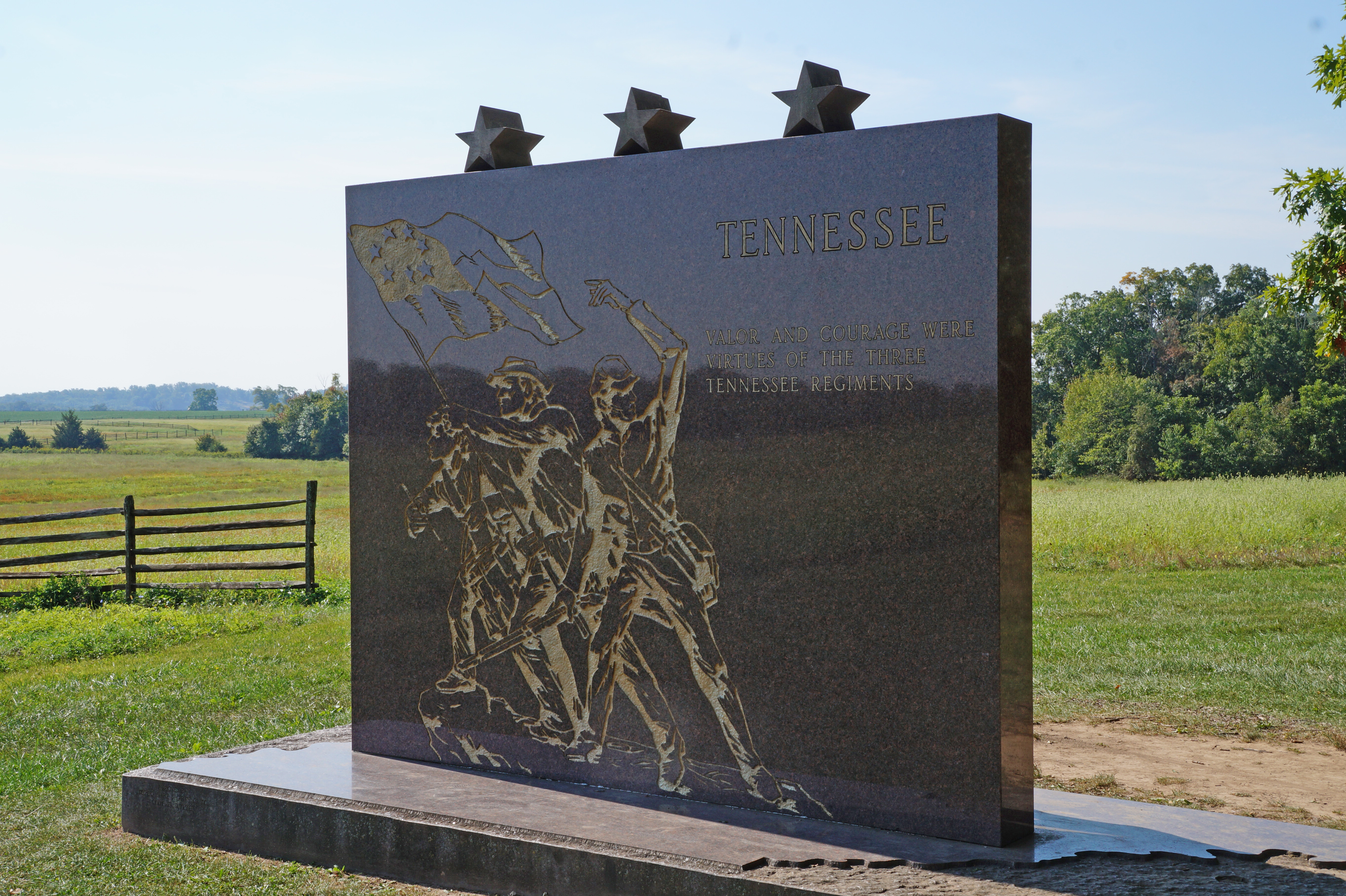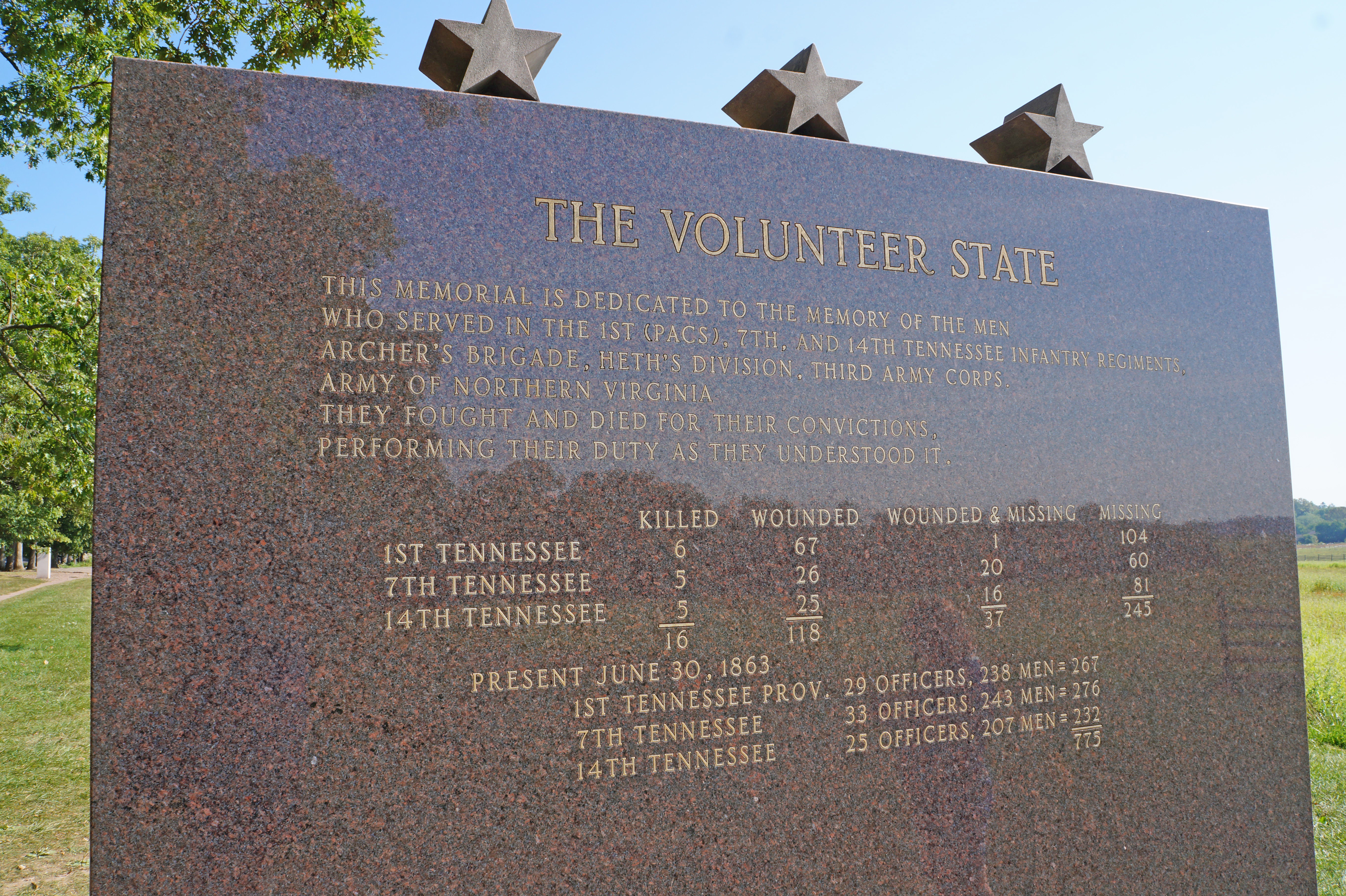 The Tennessee monument, dedicated on July 2, 1982, is the final Confederate state monument and uniquely funded entirely by private donations. It stands on a base shaped like Tennessee, with its 16-foot length symbolizing Tennessee as the 16th state of the Union. The monument features three soldiers and three stars, representing the three Tennessee regiments that fought at Gettysburg.